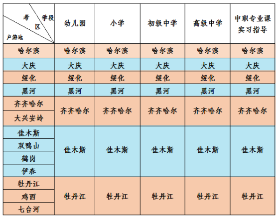 4.考区选择:面试共设哈尔滨、齐齐哈尔、牡丹江、佳木斯、大庆、绥化、黑河七个考区,考生网上报名时须根据户籍(或居住证)所在地,在校生按学籍或户籍所在地按《面试填报考区对照表》选择对应考区,不得跨区报考,农、林系统考生可就近选择考区报考。