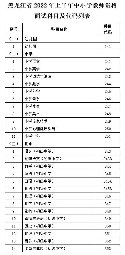 (三)初级中学教师资格考试面试分语文、数学、英语、物理、化学、生物、道德与法治、历史、地理、音乐、体育与健康、美术、信息技术、历史与社会、科学、心理健康教育、日语、俄语、朝鲜语文等19个科目。