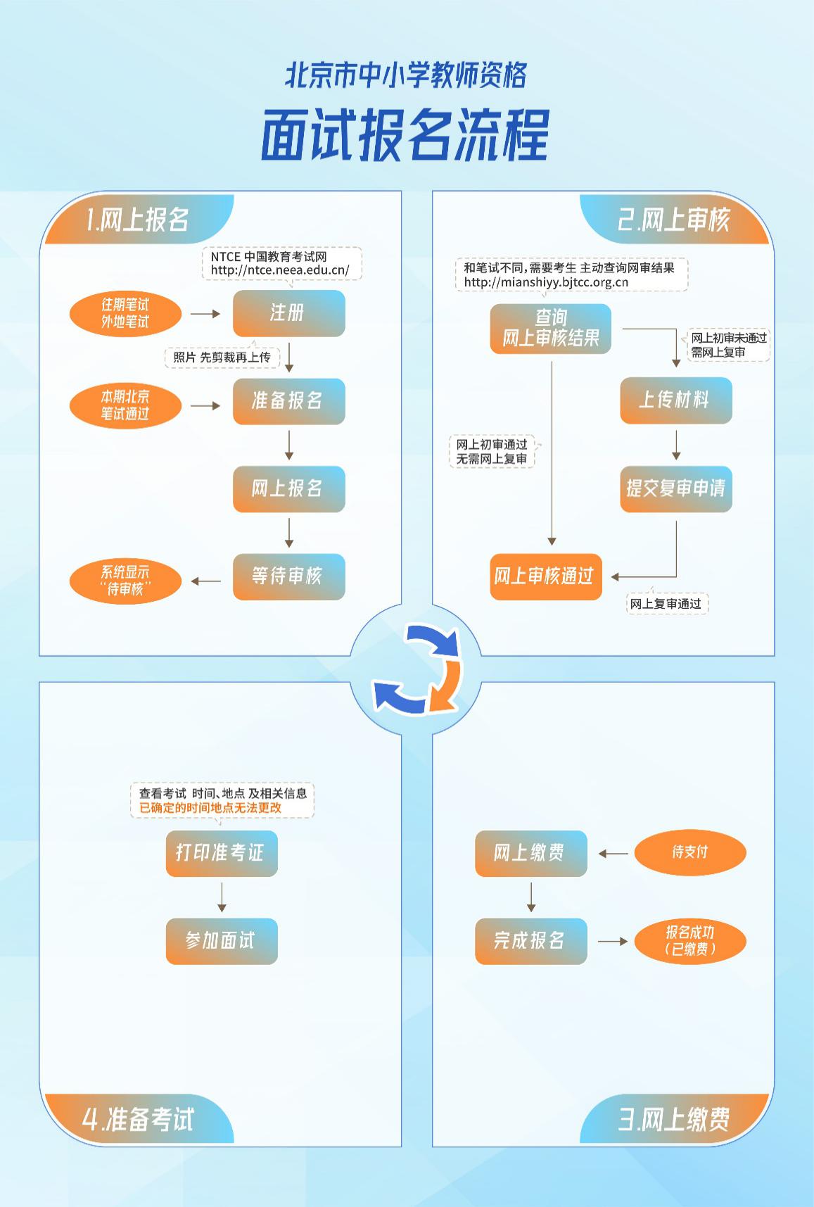 报考面试流程为:网上报名—网上审核—网上缴费—查询准考证—参加面试—查询成绩。