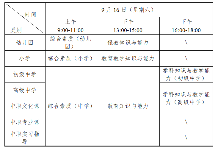 (四)全国统一考试时间为9月16日,各类别考试科目与时间安排如下: