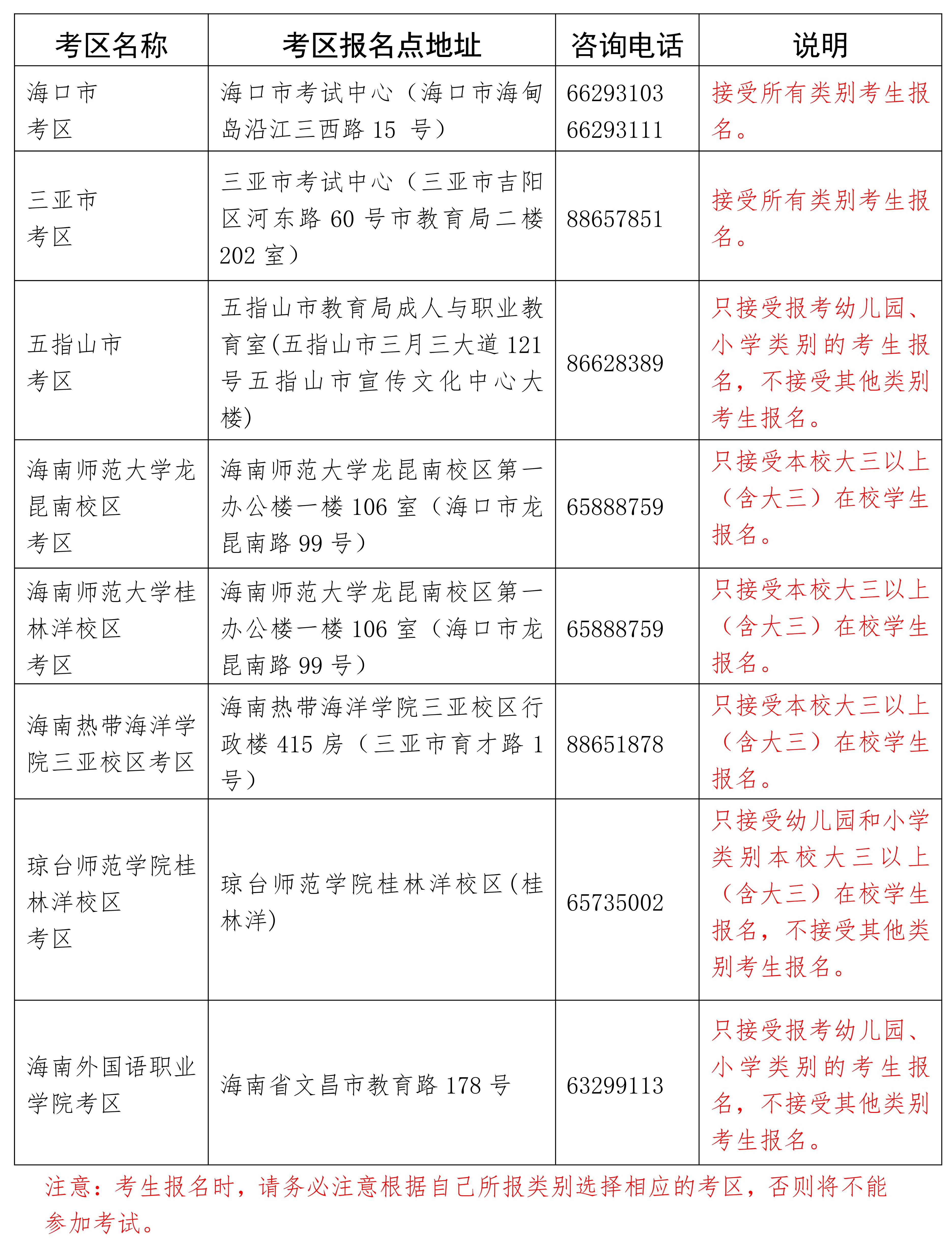 我省共设海口市、三亚市、五指山市、海南师范大学(龙昆南校区)、海南师范大学(桂林洋校区)、海南热带海洋学院(三亚校区)、琼台师范学院(桂林洋校区)和海南外国语职业学院等8个考区,报名结束后各考区根据实际报名情况设置考点,考生参加考试的考点名称和地址以准考证上的为准。现将考区信息公布如下: