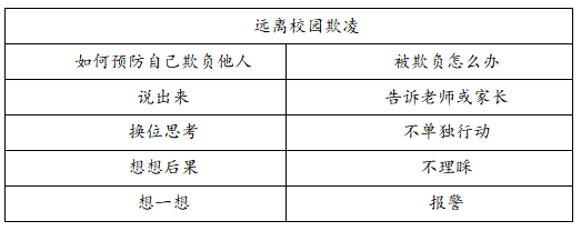 师:同学们想出了很多简单可行的好方法。当自己想欺负别人时可以这样做:说出来、换位思考,想想后果,问问自己值不值得。当被欺负时可以这样做:告诉老师或家长、不单独行动、报警。